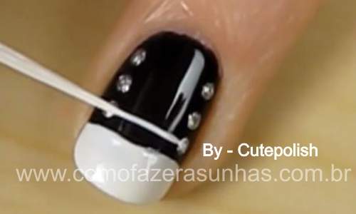 Passo 5: Com o boleador e o esmalte preto, faça pontinhos por cima das bolinhas prateadas, que foram feiras anteriormente.