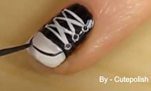 Passo 6: Com o esmalte preto e o pincel de ponta fina e longa, faça o contorno da frente do sapato all star.Não tenha pressa quando for fazer essa parte. Comece das laterais até o centro. Faça isso nos dois lados.