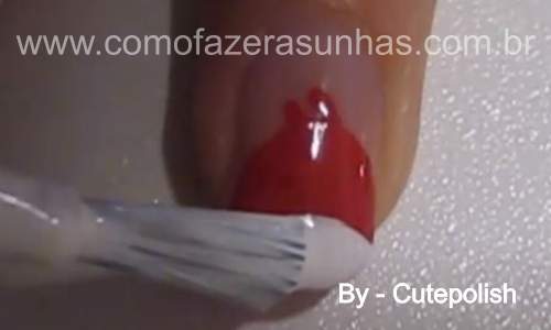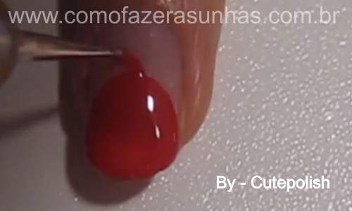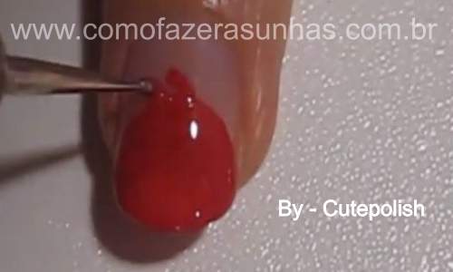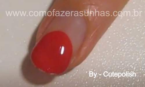 Passo 1: Com o esmalte vermelho, você irpa fazer um semi circulo. E preencher toda região com o esmalte vermelho. Espere o esmalte secar para seguir o próximo passo.