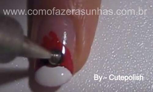 Passo 3: com o esmalte branco, faça uma francesinha, dividindo o vermelho ao meio.