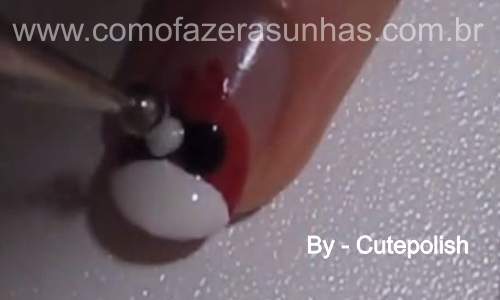Passo 5: Novamente com o boleador e o esmalte branco, faça novamente duas bolinhas por cima das bolinhas pretas, que acabamos de fazer.