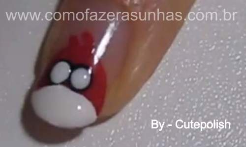 Passo 6: Com um pincel fino e longo e o esmalte preto, faça dois tracinhos acima dos olhos do angru birds, em formato de “v”