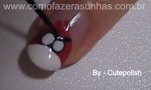 Passo 4: Com um boleador de tamanho maior e um esmalate preto, faça os olhinhos do angry birds, deixe as bolinhas uma bem próxima a outra.
