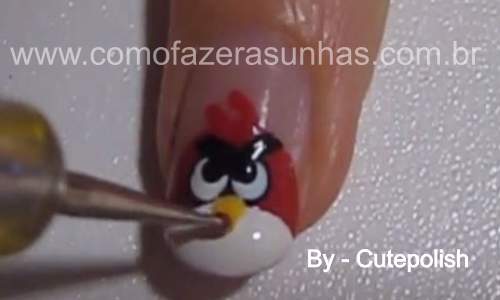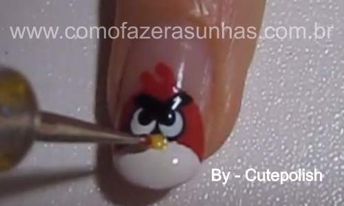 Passo 8: Com o boleador menor e o esmalte amarelo, faça o bico do angry birds. Com formato triangular. E finalize passando uma camada de esmalte extra brilho em suas unhas.