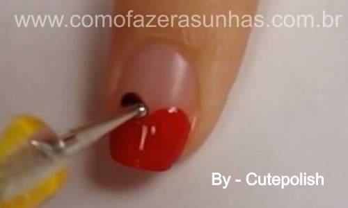 Passo 2: Com o esmalte vermelho, você irá fazer o desenho da maça, como nas imagens abaixo.