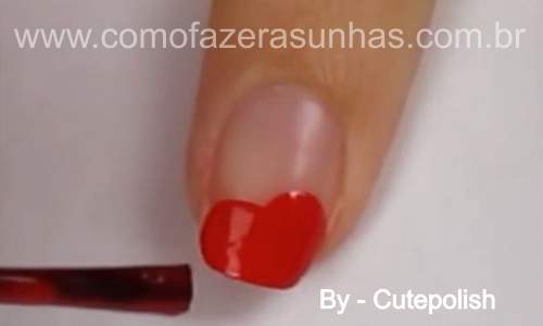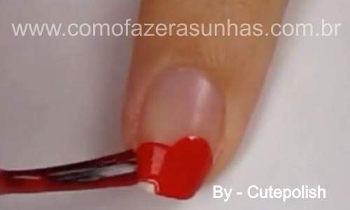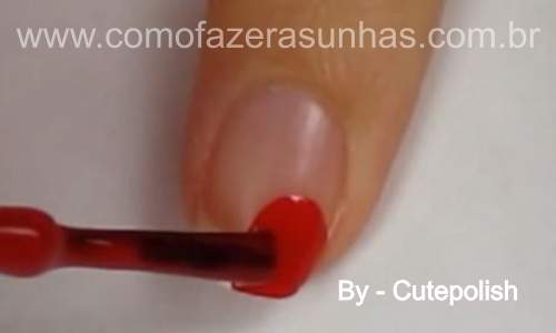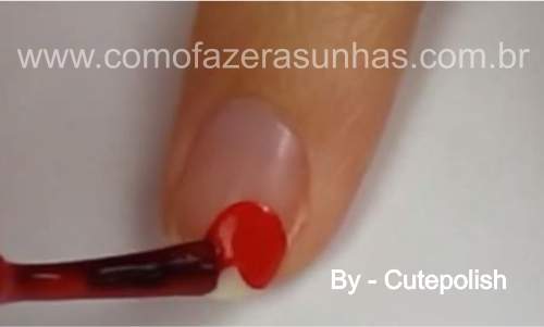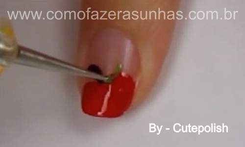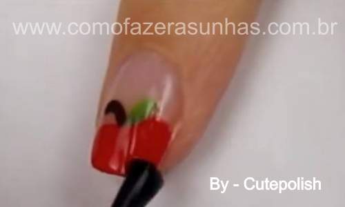 Passo 2: Com o esmalte vermelho, você irá fazer o desenho da maça, como nas imagens abaixo.
