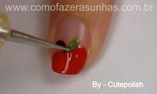 Passo 4: Novamente com o boleador e o esmalte verde, faça a folhinha da maça por cima do esmalte vermelho