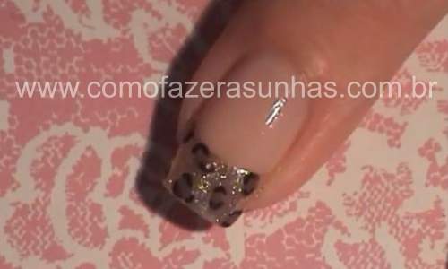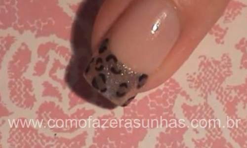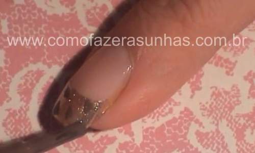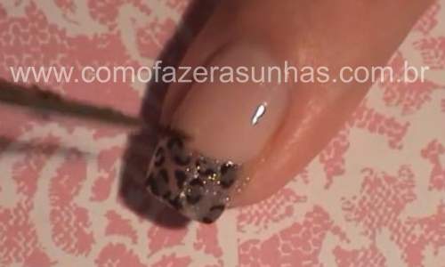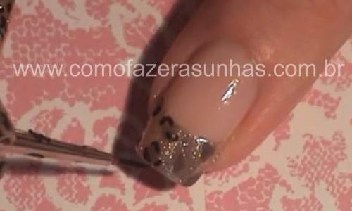 “Antes de iniciar a decoração nas unhas com as manchinhas da onça, faça uma francesinha em todas as suas unhas com o esmalte cintilante dourado e espere secar.”