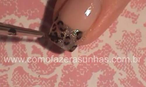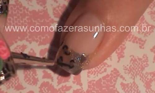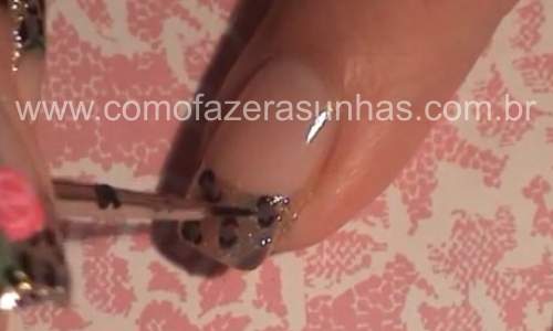 Passo 1: Já com a francesinha completamente seca, vamos fazer as manchinhas da onça. Primeiro faça vários pontinhos com o esmalte marrom na francesinha. Espere secar.