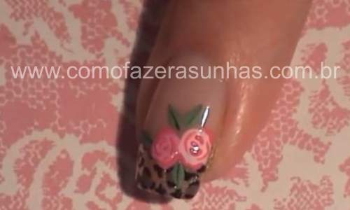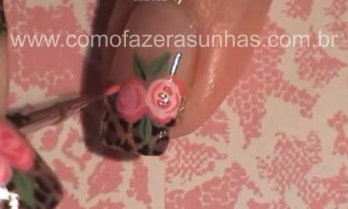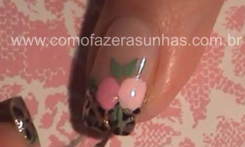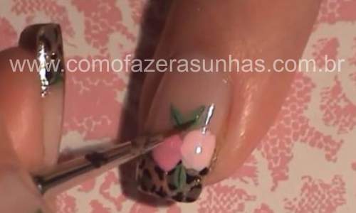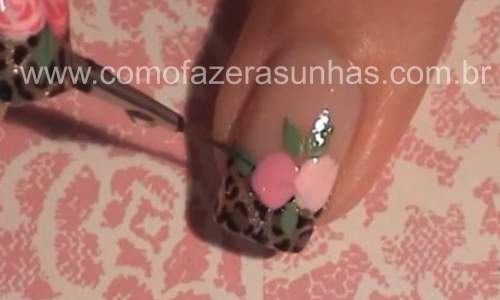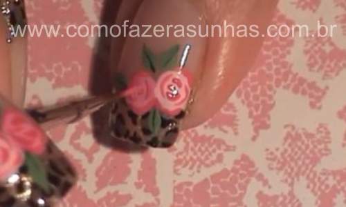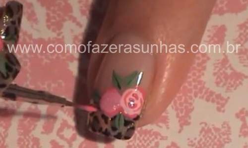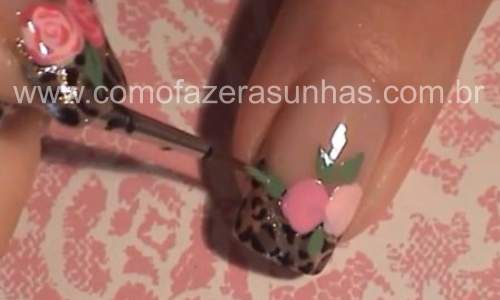 Passo 4: Com o esmalte verde claro e um pincel de ponta fina, faça as folhinhas ao redor das rosas.