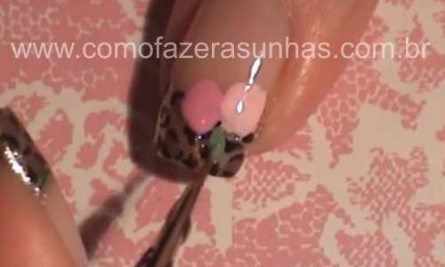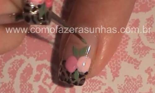 Passo 6: Com o esmalte rosa escuro e o pincel fino, dê forma as pétalas das rosas.Com é descrito nas imagens abaixo.